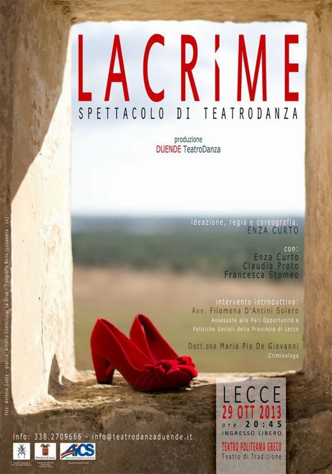 LACRIME, in questa occasione rappresentato perché inserito nella Rassegna Teatrale "COLPI DI GENIO" organizzata dall'Assessorato ai Servizi Sociali e Pari Opportunità della Provincia di Lecce per sensibilizzare e contrastare il fenomeno della violenza sulle donne e minori, “nasce” nella primavera del 2007 come performance interattiva con una installazione, dalla quale prende il titolo, dell'Artista Paolo Spalluto all'interno di una mostra collettiva d'arte contemporanea organizzata dal Comune di Lecce sul tema della violenza sulle donne.